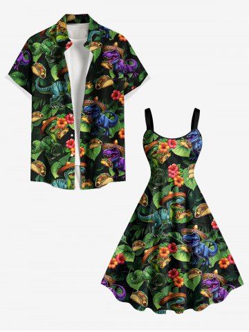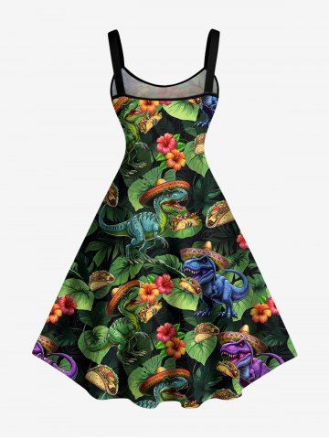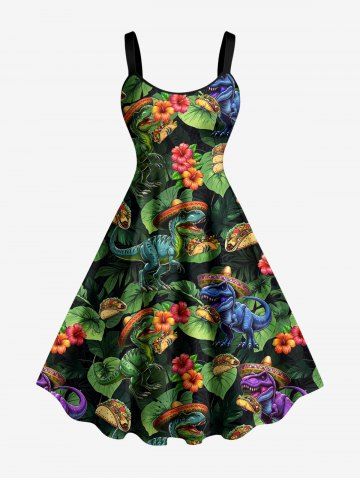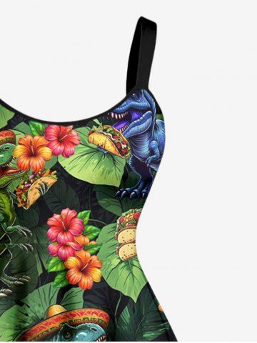 Robe débardeur hawaïenne à imprimé dinosaures, fleurs et feuilles, grande taille - Vert Profond - S