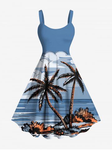 Robe débardeur hawaïenne grande taille à imprimé cocotiers, nuages et paysage marin - Bleu Clair - Bleu Clair