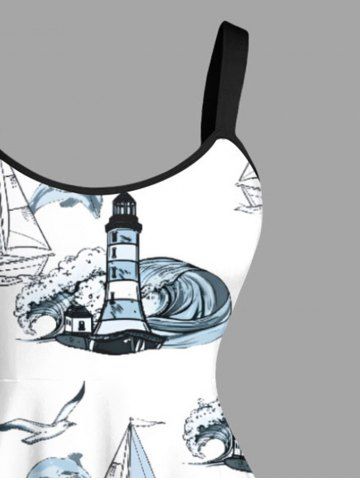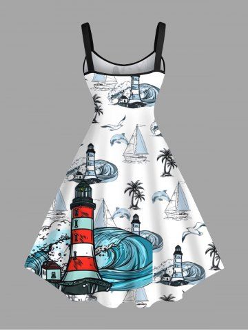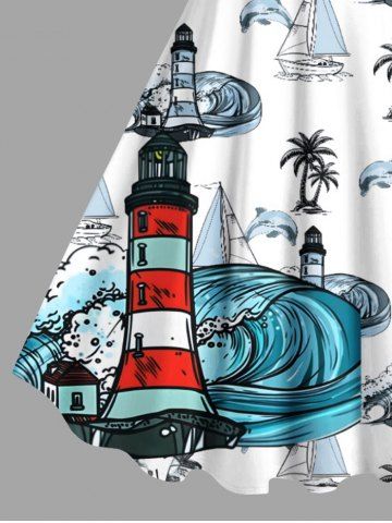 Robes Graphiques > Robe débardeur hawaïenne grande taille à imprimé cocotiers, requins, bateau, vagues, phare, croisière