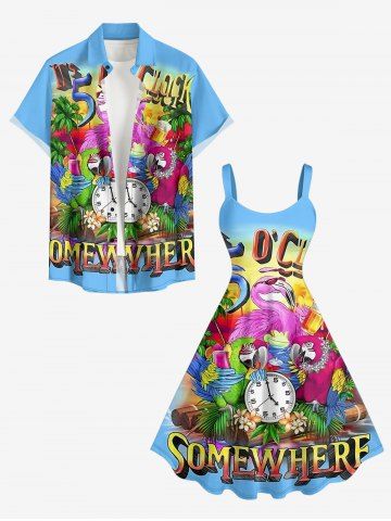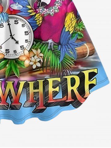 Robe débardeur hawaïenne grande taille à imprimé perroquet, fleur, cocotier et horloge - Bleu Ciel - Bleu Ciel