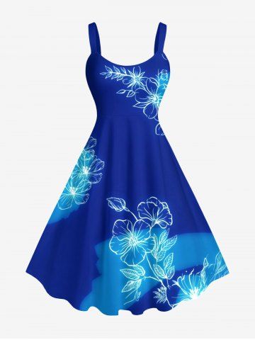 Robe Débardeur Trapèze en Blocs de Couleurs Fleur et Feuille Imprimées de Grande Taille - Bleu - Bleu