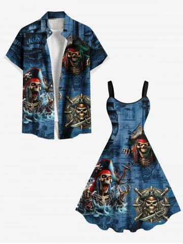 Robe débardeur trapèze grande taille à imprimé tête de mort, pirate, vagues, voilier, croisière hawaïenne, ombrée - Bleu - Bleu