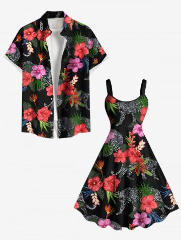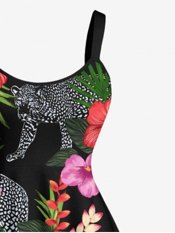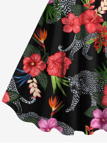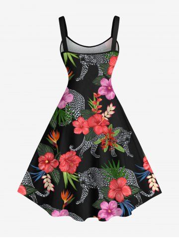 Robe débardeur trapèze hawaïenne grande taille à imprimé léopard et feuilles tropicales et fleurs d'hibiscus - Noir - Noir
