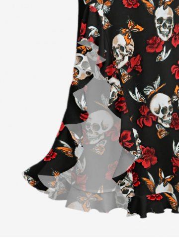 Robe fendue à volants, imprimé papillons et fleurs à têtes de mort - Noir - Noir