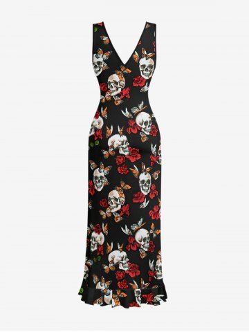 Robe fendue à volants, imprimé papillons et fleurs à têtes de mort - Noir - Noir