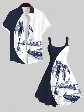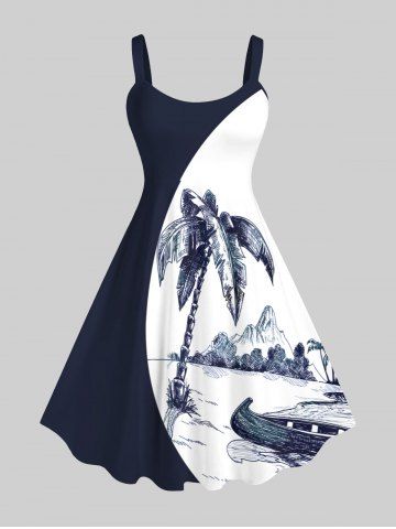 Robes Graphiques > Robe Hawaï en Blocs de Couleurs Montagne Arbre Noix de Coco et Mer Imprimés de Grande Taille