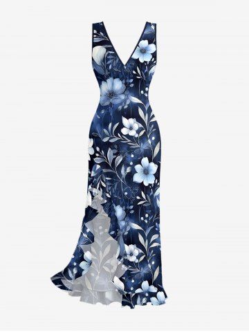 Robe hawaïenne à imprimé fleurs et feuilles, volants, fente et décolleté cache-cœur - Bleu Profond - Xxl