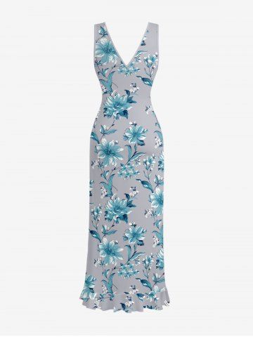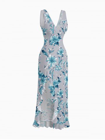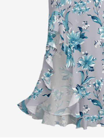 Robe hawaïenne à imprimé floral et feuilles, grande taille, volants, fente et décolleté cache-cœur - Gris Clair - Gris Clair