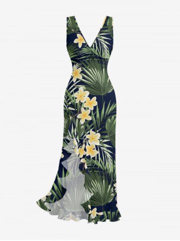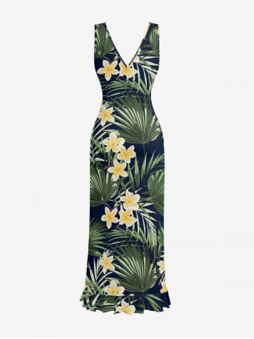 Robe hawaïenne à imprimé floral tropical et feuilles, à volants et fente cache-cœur - Vert Profond - L