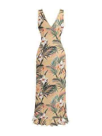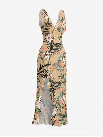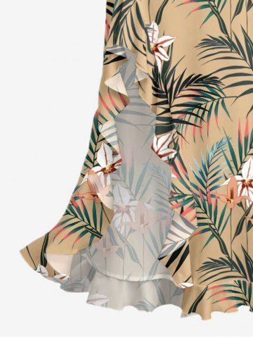Robe hawaïenne à imprimé tropical fleurs et feuilles, volants et fente cache-cœur - Bronze - Xs