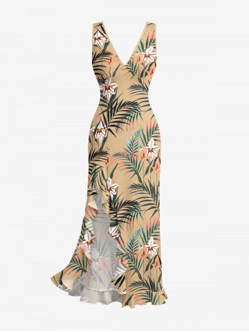 Robes Graphiques > Robe hawaïenne à imprimé tropical fleurs et feuilles, volants et fente cache-cœur