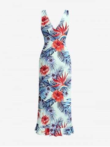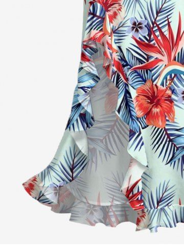 Robes Graphiques> Robe hawaïenne à volants, imprimé de feuilles tropicales et fleurs d'hibiscus, fendue et cache-cœur, à volants et imprimé de feuilles tropicales
