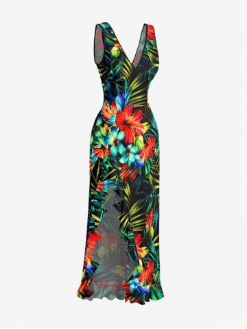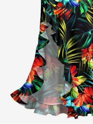 Robes Graphiques> Robe hawaïenne à volants, imprimé de feuilles tropicales et fleurs d'hibiscus, fendue et cache-cœur, à volants et imprimé de feuilles tropicales