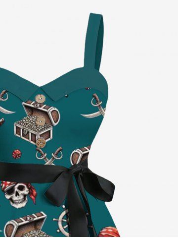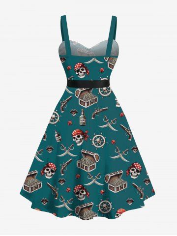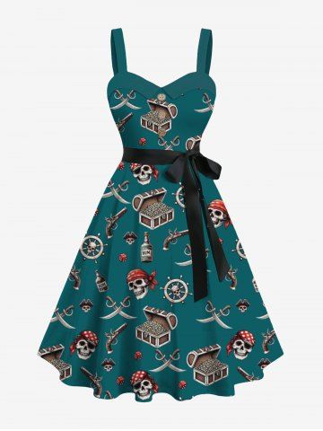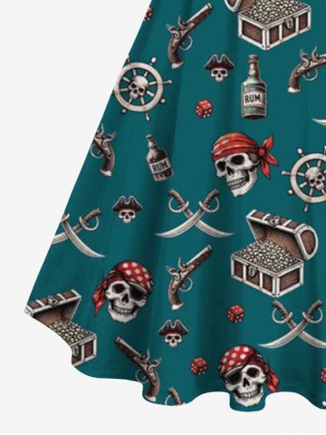 Robe hawaïenne grande taille à col rabattu et ceinture, motif tête de mort, bateau pirate, gouvernail, pistolet, couteau, imprimé croisière - Vert Profond - 5x