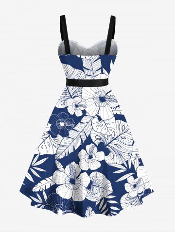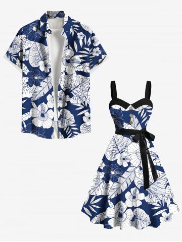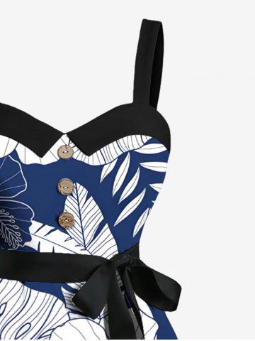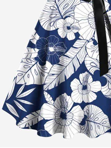 Robe hawaïenne grande taille à imprimé feuilles tropicales et fleurs d'hibiscus, col rabattu et boutons, avec ceinture - Bleu Profond - 1x