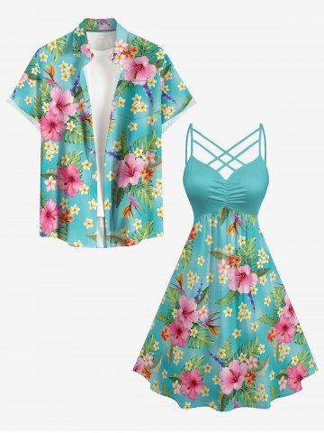 Robe hawaïenne grande taille à imprimé floral d'hibiscus et feuilles tropicales, bretelles croisées et froncées. - Turquoise Foncée - 1x