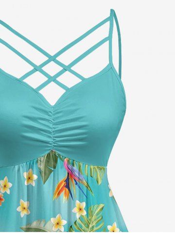 Robe hawaïenne grande taille à imprimé floral d'hibiscus et feuilles tropicales, bretelles croisées et froncées. - Turquoise Foncée - 3x