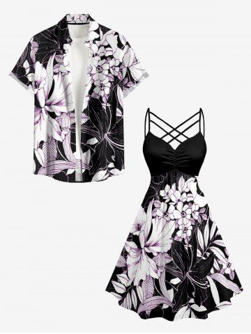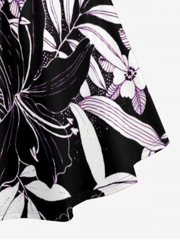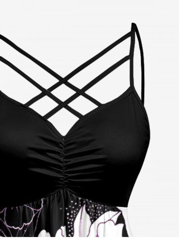 Robe hawaïenne grande taille à imprimé floral et feuilles, froncée et bretelles croisées. - Noir - Noir