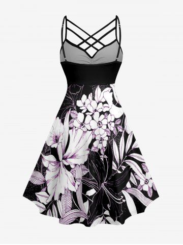 Robe hawaïenne grande taille à imprimé floral et feuilles, froncée et bretelles croisées. - Noir - Noir