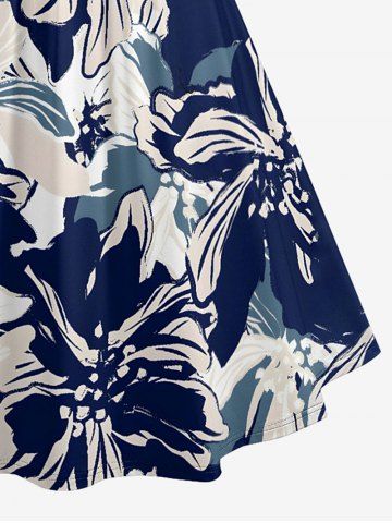 Robe hawaïenne grande taille à imprimé floral et feuilles, froncée et bretelles croisées. - Bleu Profond - L