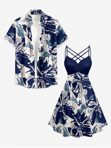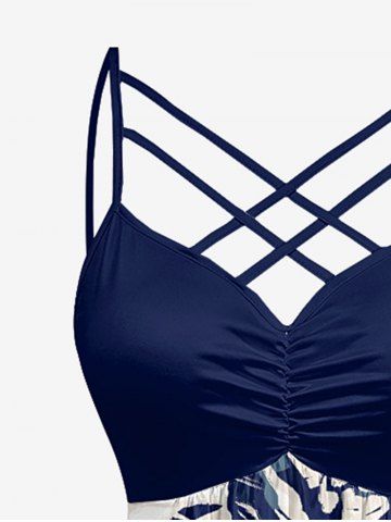 Robe hawaïenne grande taille à imprimé floral et feuilles, froncée et bretelles croisées. - Bleu Profond - 5x