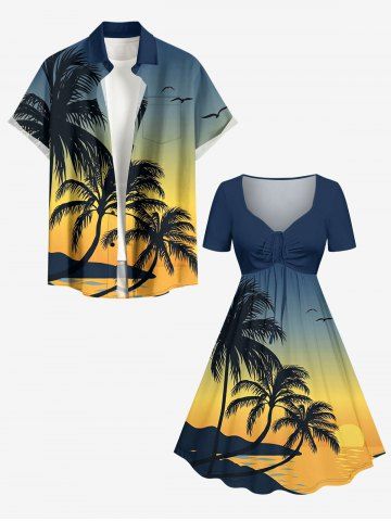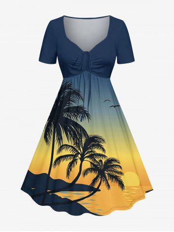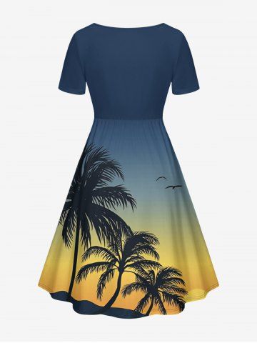 Robe hawaïenne grande taille à imprimé ombré cocotier et oiseaux, cintrée - Bleu Profond - M