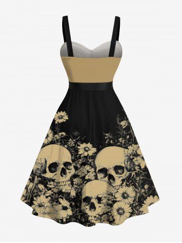 Robe hawaïenne grande taille à imprimé tête de mort, marguerites, boutons, col rabattu et ceinture - Noir - Noir