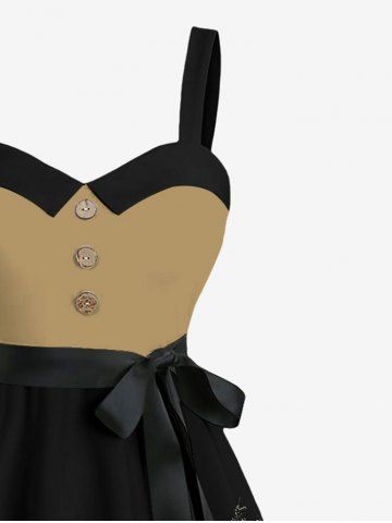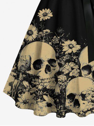 Robe hawaïenne grande taille à imprimé tête de mort, marguerites, boutons, col rabattu et ceinture - Noir - Noir