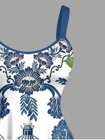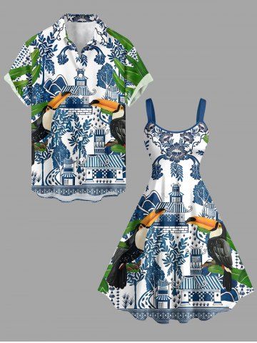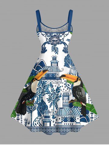 Robes Graphiques > Robe hawaïenne grande taille à imprimé toucans tropical, feuilles bleues et blanches, style porcelaine, coupe trapèze