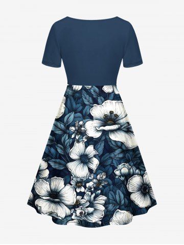 Robe hawaïenne grande taille à imprimé tropical floral et feuilles, cintrée - Bleu Profond - 4x
