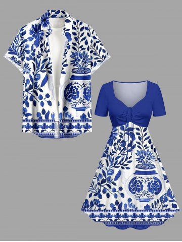Robes Graphiques > Robe hawaïenne grande taille en porcelaine bleue et blanche à motif de vase, fleurs et feuilles, cintrée