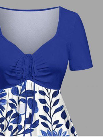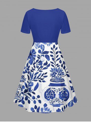 Robe hawaïenne grande taille en porcelaine bleue et blanche à motif de vase, fleurs et feuilles, cintrée - Bleu - Bleu