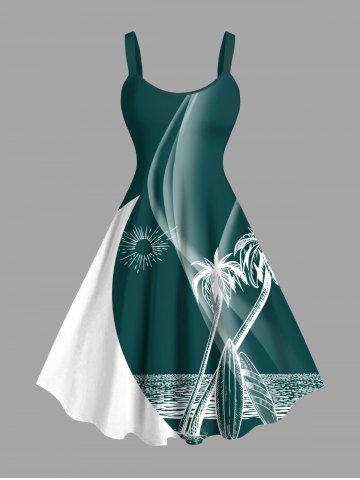 Robes Graphiques > Robe hawaïenne grande taille imprimée cocotiers, soleil et mer, coupe trapèze