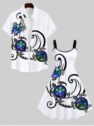 Curve Flower Turtle Sea Waves Print Plus Size Matching Hawaii Beach Outfit For Couples