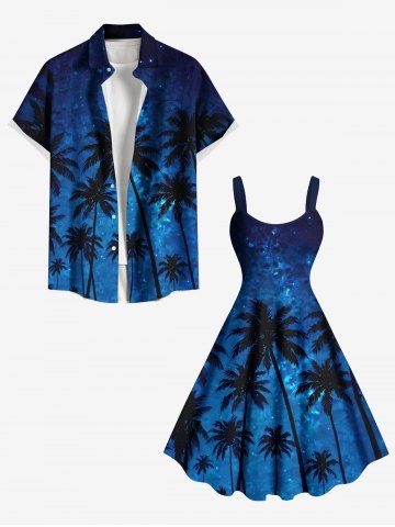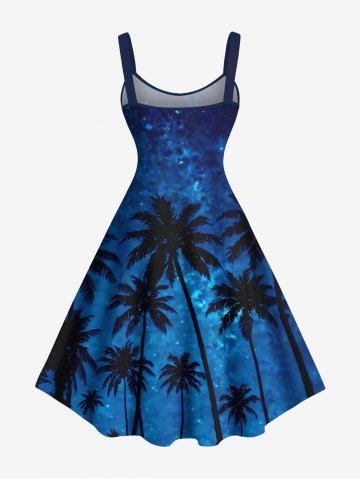 Robe Ligne A Arbre Noix de Coco et Galaxie Imprimés de Grande Taille à Paillettes - Bleu - Bleu
