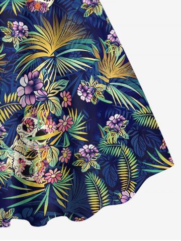 Skulls Coconut Tree Leaf Flower Print Backless Dress and Button Shirt Plus Size Matching Hawaii Beach Outfit for Couples