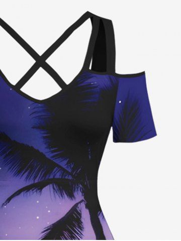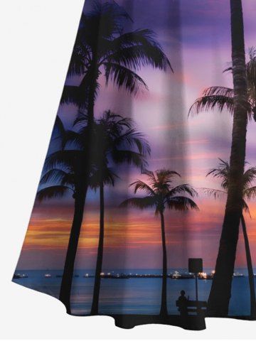 Robes Graphiques > Robe longue grande taille à imprimé galaxie crépuscule et cocotiers, style hawaïen, épaules dénudées et croisée, coupe trapèze.