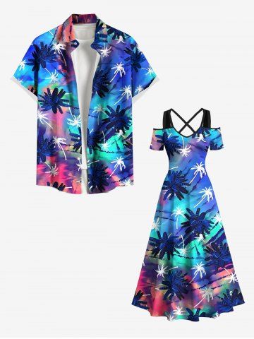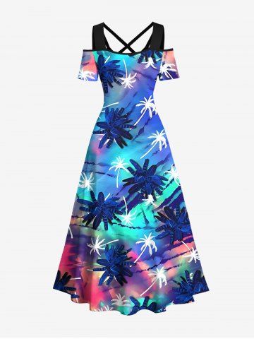 Robes Graphiques > Robe longue grande taille à imprimé ombré coloré et motif cocotier hawaïen, épaules dénudées et croisée trapèze