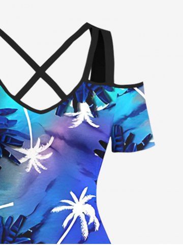 Robe longue grande taille à imprimé ombré coloré et motif cocotier hawaïen, épaules dénudées et croisée trapèze - Bleu Ciel - Bleu Ciel
