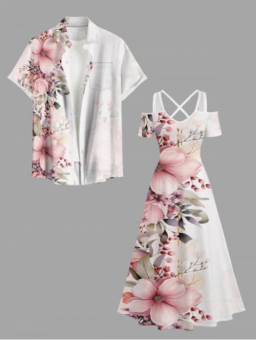 Robe longue hawaïenne à imprimé floral et feuilles grande taille, épaules dénudées et croisée - Rose - Rose