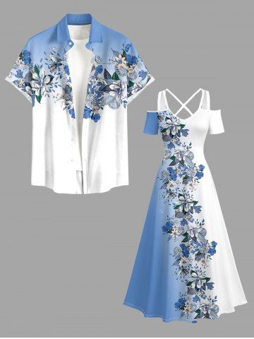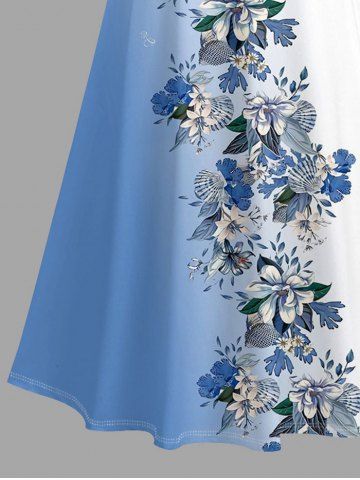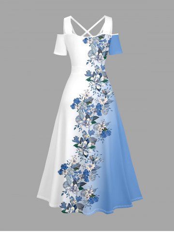 Robe longue hawaïenne à imprimé floral ombré et colorblock grande taille, épaules dénudées et croisée, style dégradé. - Bleu Ciel - Bleu Ciel