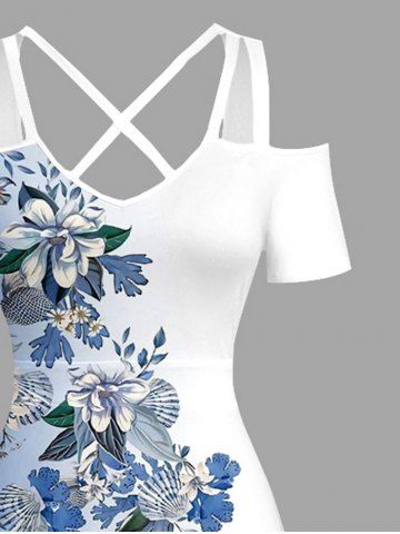 Robes Graphiques > Robe longue hawaïenne à imprimé floral ombré et colorblock grande taille, épaules dénudées et croisée, style dégradé.