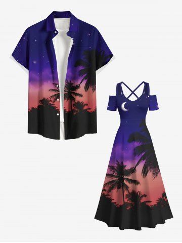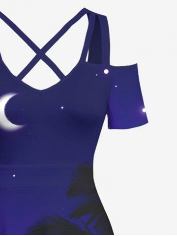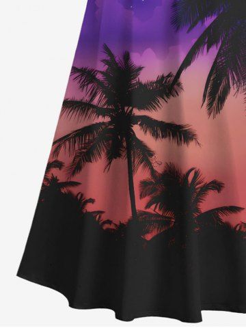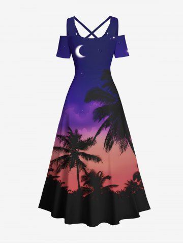 Robes Graphiques > Robe longue hawaïenne grande taille à imprimé cocotier, lune, ciel ombré, étoiles, épaules dénudées, croisée