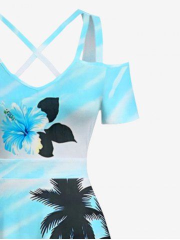 Robe longue hawaïenne grande taille à imprimé cocotiers et fleurs d'hibiscus, épaules dénudées et croisée - Bleu Ciel - Bleu Ciel