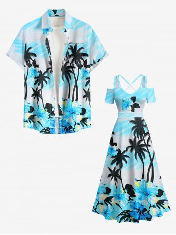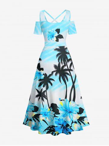 Robe longue hawaïenne grande taille à imprimé cocotiers et fleurs d'hibiscus, épaules dénudées et croisée - Bleu Ciel - Bleu Ciel