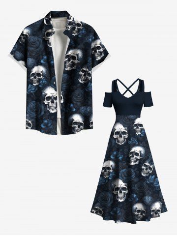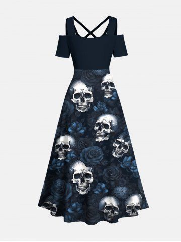 Robes Graphiques > Robe longue hawaïenne grande taille à imprimé tête de mort et roses, épaules dénudées et croisée