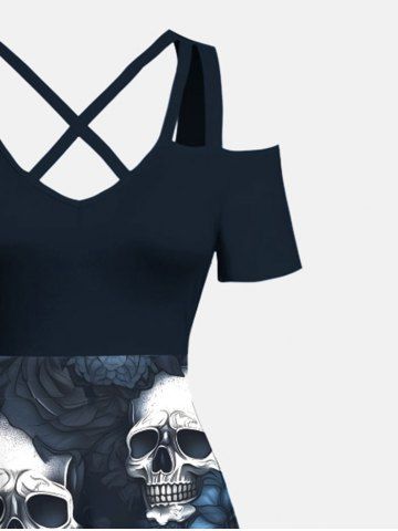 Robe longue hawaïenne grande taille à imprimé tête de mort et roses, épaules dénudées et croisée - Noir - Noir