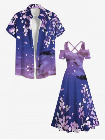 Robes Graphiques > Robe longue trapèze à épaules dénudées, imprimé dégradé ciel galaxie nuage feuilles branches, style hawaïen, grande taille