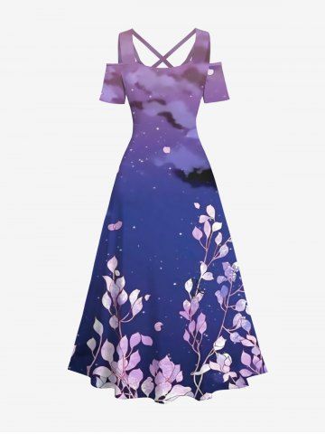 Robe longue trapèze à épaules dénudées, imprimé dégradé ciel galaxie nuage feuilles branches, style hawaïen, grande taille - Multi-a - 6x
