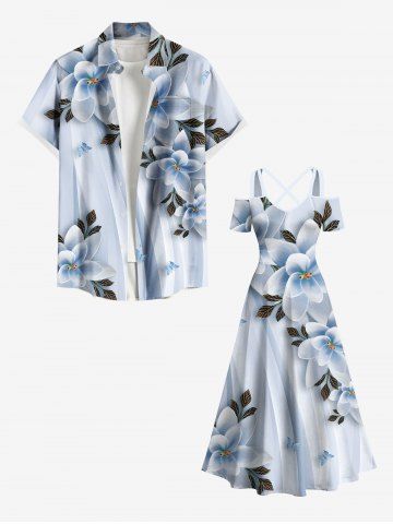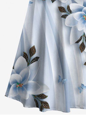 Robe longue trapèze grande taille à imprimé ombré de fleurs, feuilles et papillons, style hawaïen, épaules dénudées et croisée - Bleu Poudre - 3x